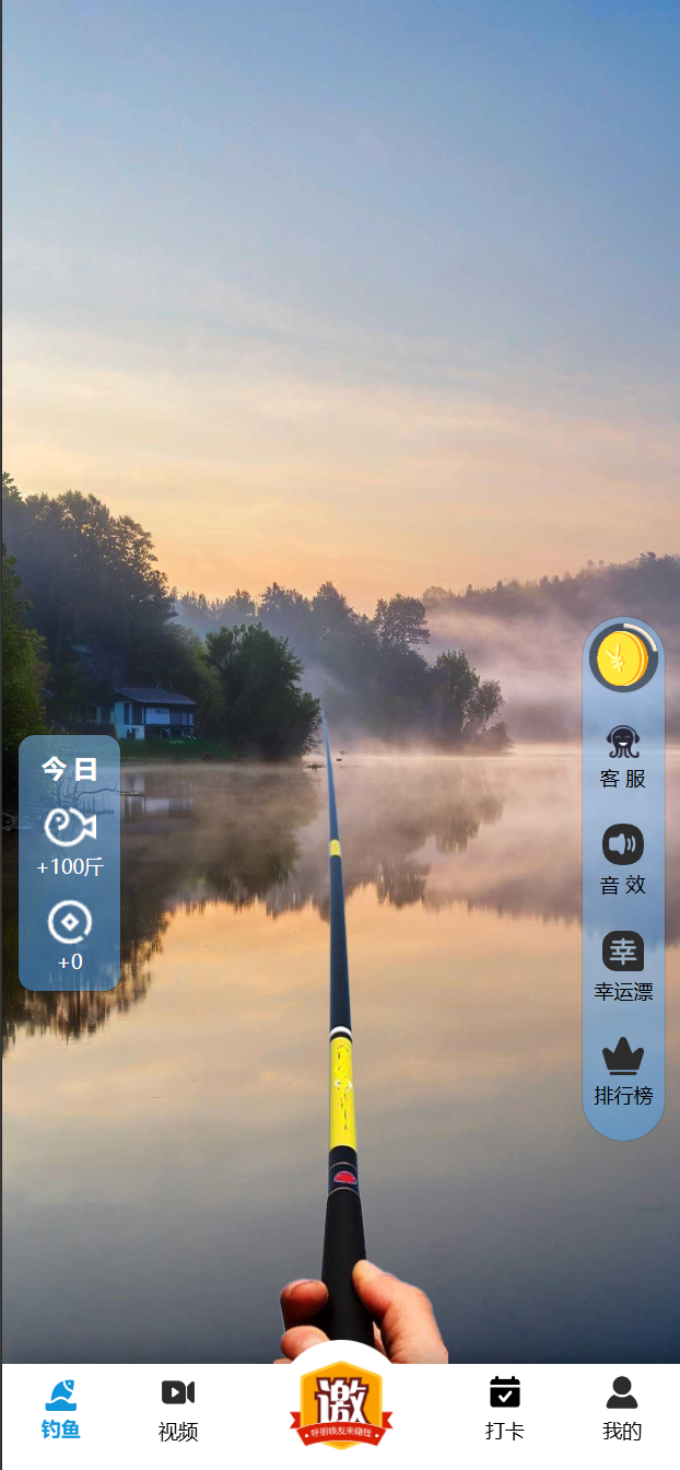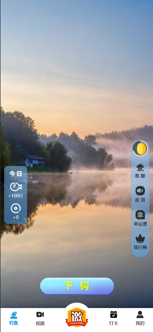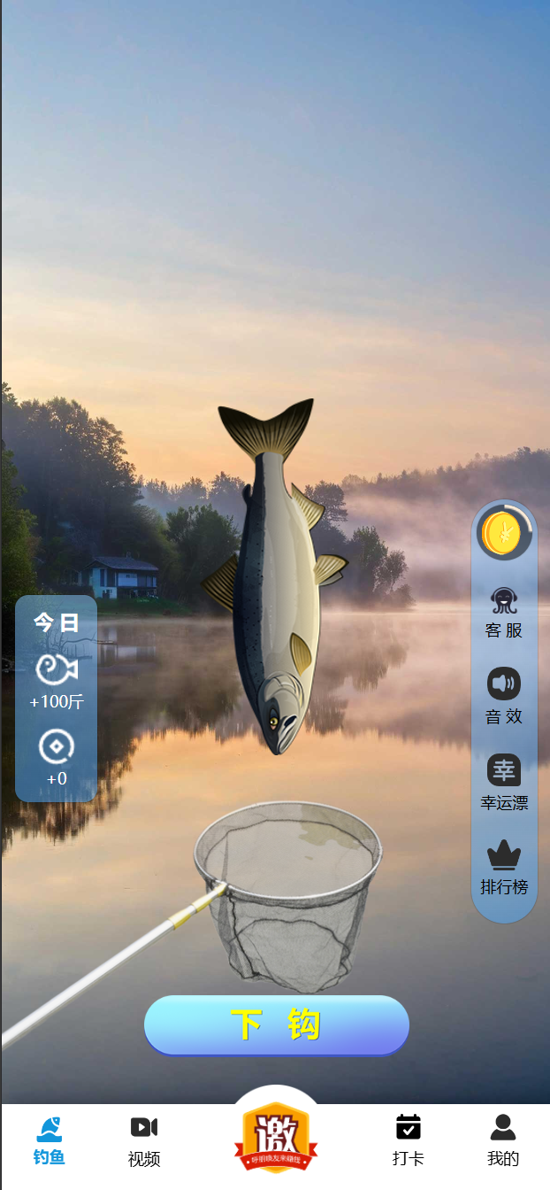 根据场景选择适合的诱饵,点击屏幕底部的下钩按钮,会发现有甩杆动作,鱼钩沉入湖底。